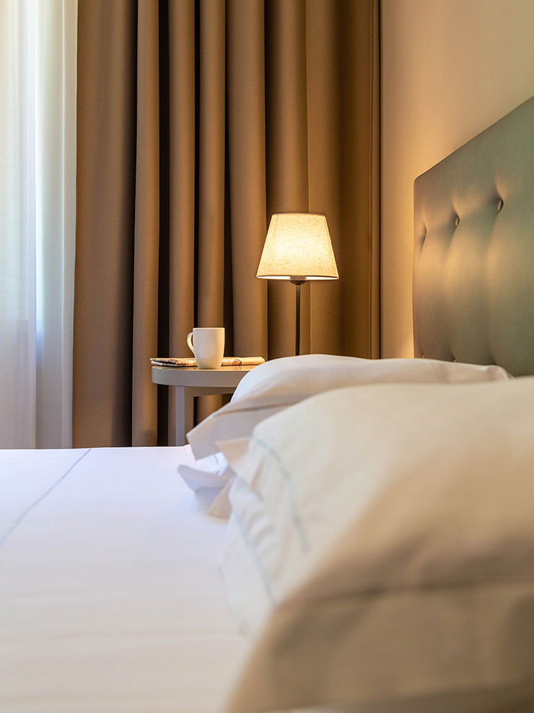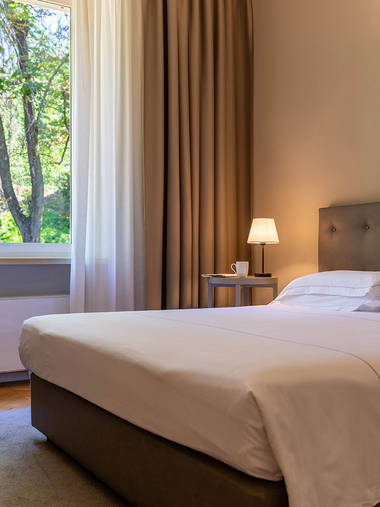 Ogni ambiente è arredato con uno stile classico ed elegante, caratterizzato da toni neutri e materiali pregiati. Le ampie finestre regalano una luce avvolgente e affacci suggestivi sui vigneti circostanti, permettendo agli ospiti di svegliarsi con una vista unica e di immergersi completamente nella magia del paesaggio.